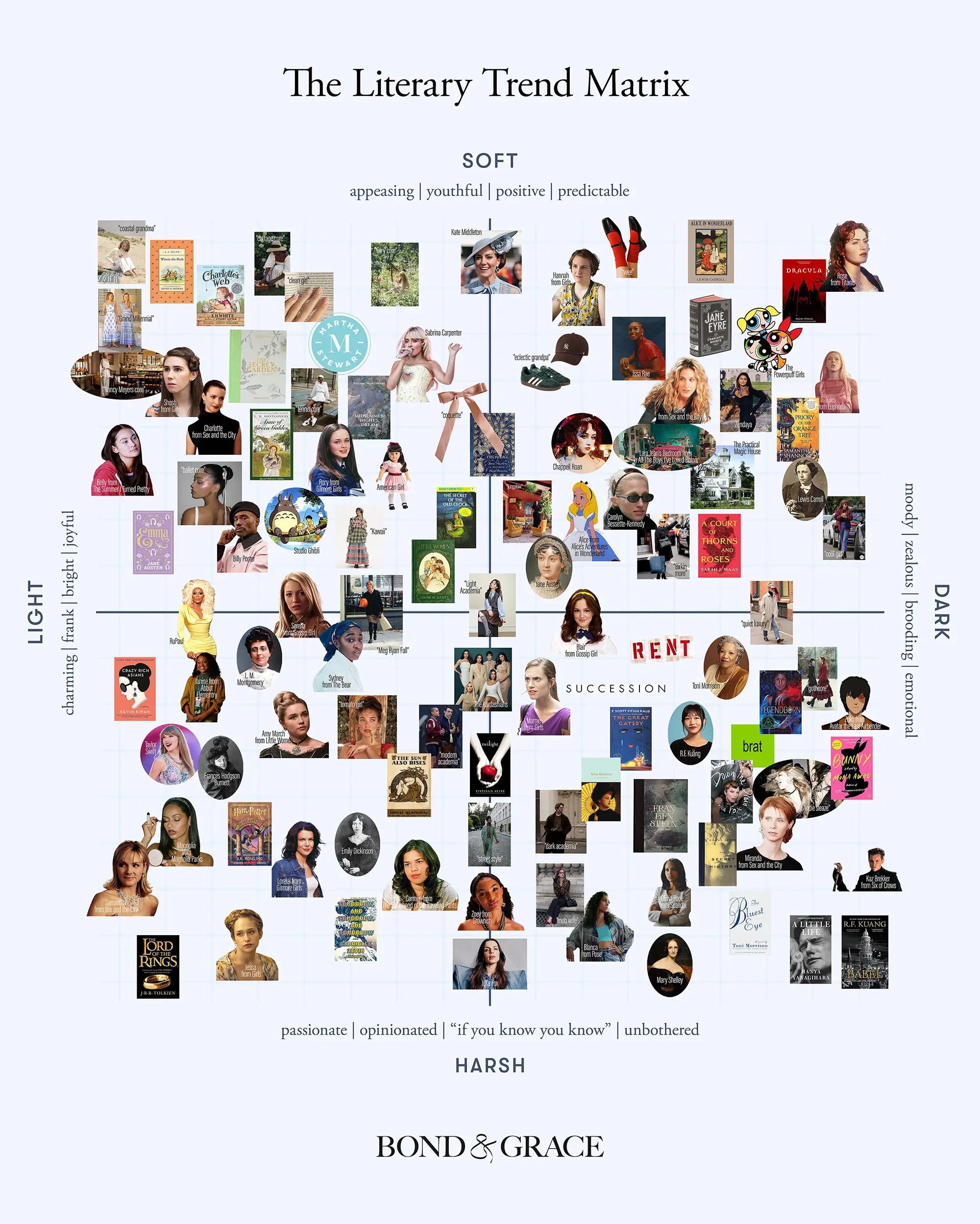 In honor of our beloved bibliophile community, our in-house trend forecaster, Sarah Grace Acker, helped us curate a comprehensive matrix which beautifully plots some of our favorite trends from the last several months alongside books and characters you know and love. The matrix can serve as a visual tool for how to identify modern aesthetics. You’ll find “brat” intermixed with some of your favorite titles, brands, and pop culture moments to help make sense of the current trend landscape.