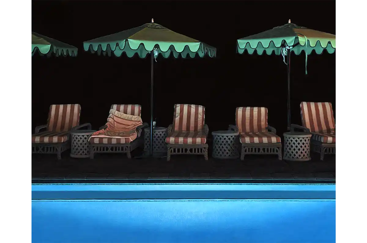 Often using the interplay of light and darkness to reveal an unsettling stillness, the five works in Leah’s Gatsby collection illuminate the haunting underbelly of American perfection. A lone lounge chair and abandoned martini glass baking in the morning light; a ladder vanishing beneath the glow of a poison-green pool; headlights glowing like all-seeing eyes; a damp towel asking, is anyone there? Paradoxes abound: a party-scene but no revelers, a pool too eerie to enter; grand hedges casting outsized shadows. The hyperrealistic precision with which these scenes are depicted only deepens their mystery. Just as her paintings prompt us to probe the happenings within each scene, they also pose a more fundamental question: are these photographs, or could they be flawlessly rendered paintings? Existing somewhere in between the two mediums—and executed with the exacting skill of a person fastidiously attuned to detail—Leah’s work demands that we enter into a process of questioning and seeking.