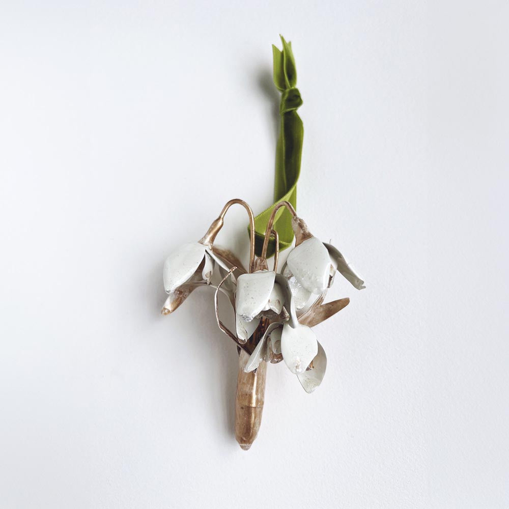 The Snowdrops’ bowed head beckons you closer, its golden stem and leaves shimmer in the light. Like a long winter, it requires patience if you want to see its true beauty. Available in White/Gold, experience the wonder of the season with a flower as delicate and unique as a snowflake. By Karen Davis.